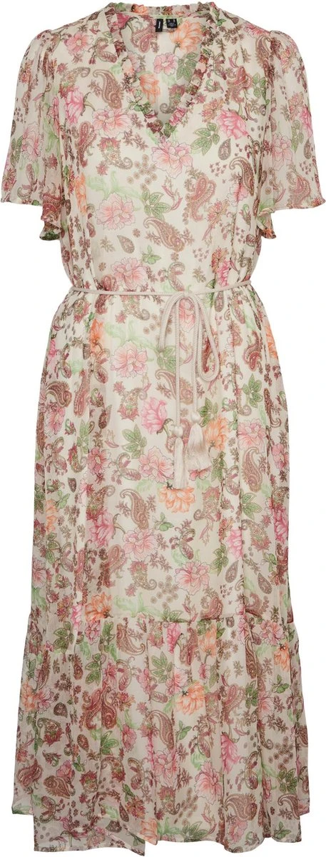 Bloemenprints voegen de juiste hoeveelheid elegantie toe, waardoor een gebloemde jurk perfect is voor jouw zomergarderobe. Als de look er te schattig uitziet kun je het cooler maken met een paar gave sneakers. Vergeet je favoriete accessoires niet!. – Type product : Jurk- Hals : V-Hals- Mouw lengte : Korte mouwen- Sluiting : Riem in de taille- Voering : Zachte, rekbare voering- Details : Riem die de taille accentueert, Riem in de taille, Gevlochten detail- Print : All-over print, herhaald over de hele stof