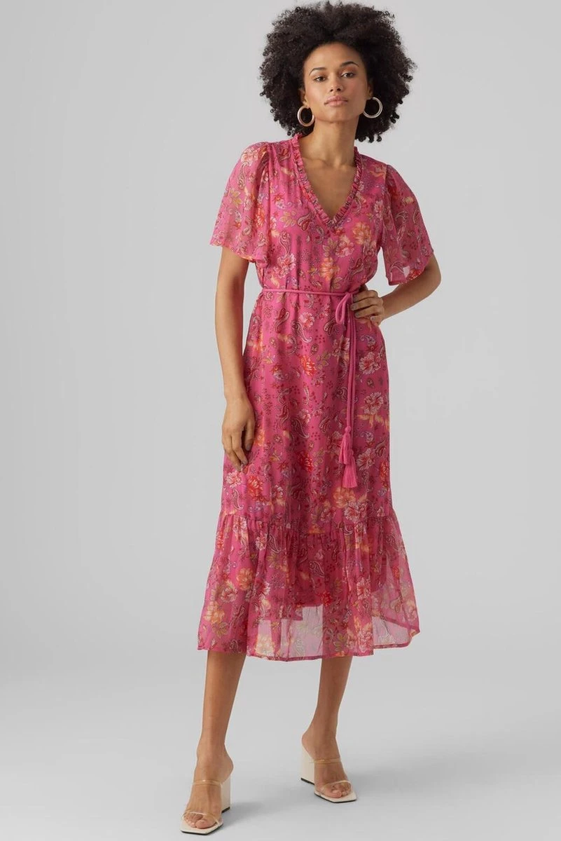 Bloemenprints voegen de juiste hoeveelheid elegantie toe, waardoor een gebloemde jurk perfect is voor jouw zomergarderobe. Als de look er te schattig uitziet kun je het cooler maken met een paar gave sneakers. Vergeet je favoriete accessoires niet!. – Type product : Jurk- Hals : V-Hals- Mouw lengte : Korte mouwen- Sluiting : Riem in de taille- Voering : Zachte, rekbare voering- Details : Riem die de taille accentueert, Riem in de taille, Gevlochten detail- Print : All-over print, herhaald over de hele stof